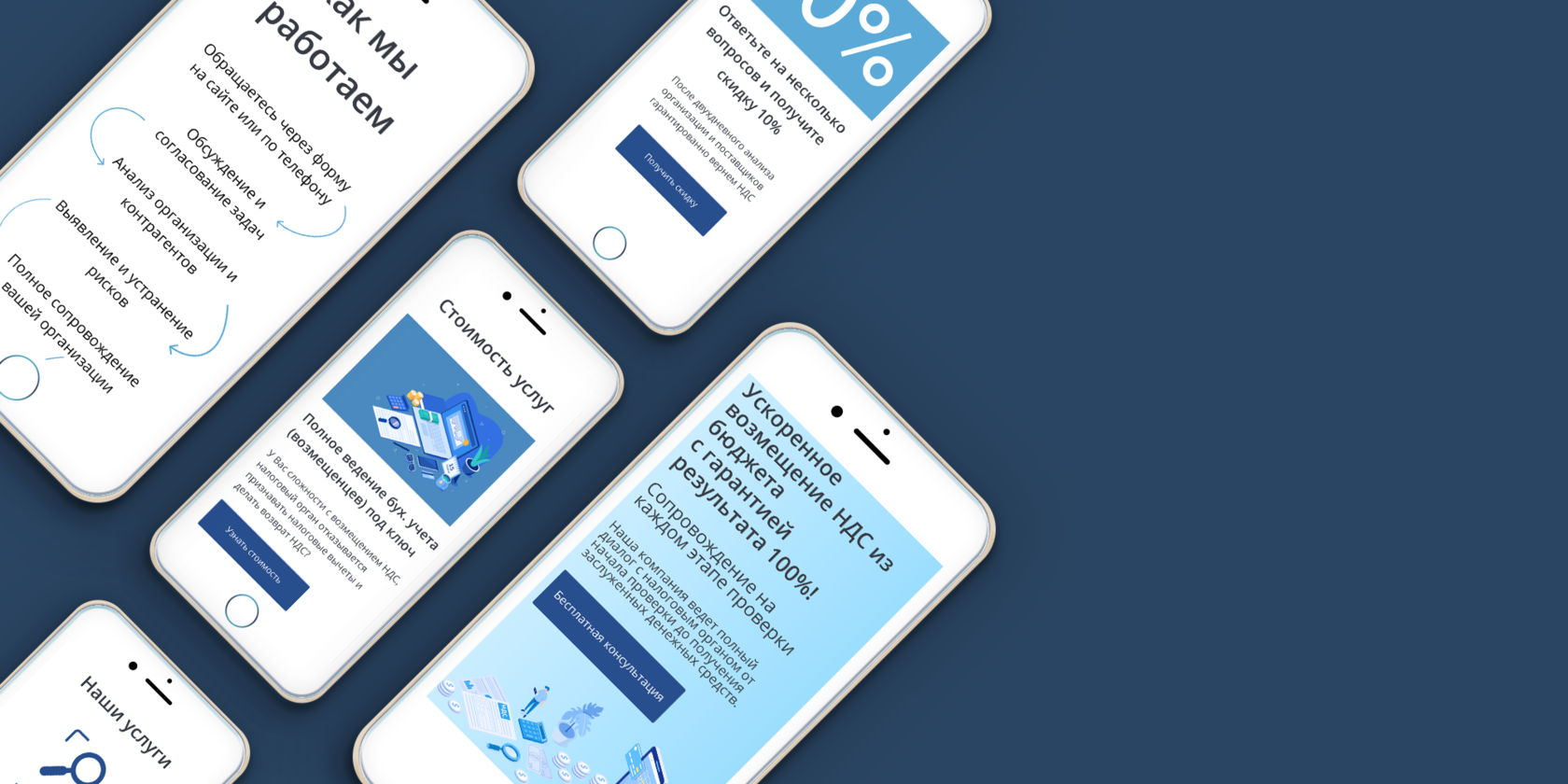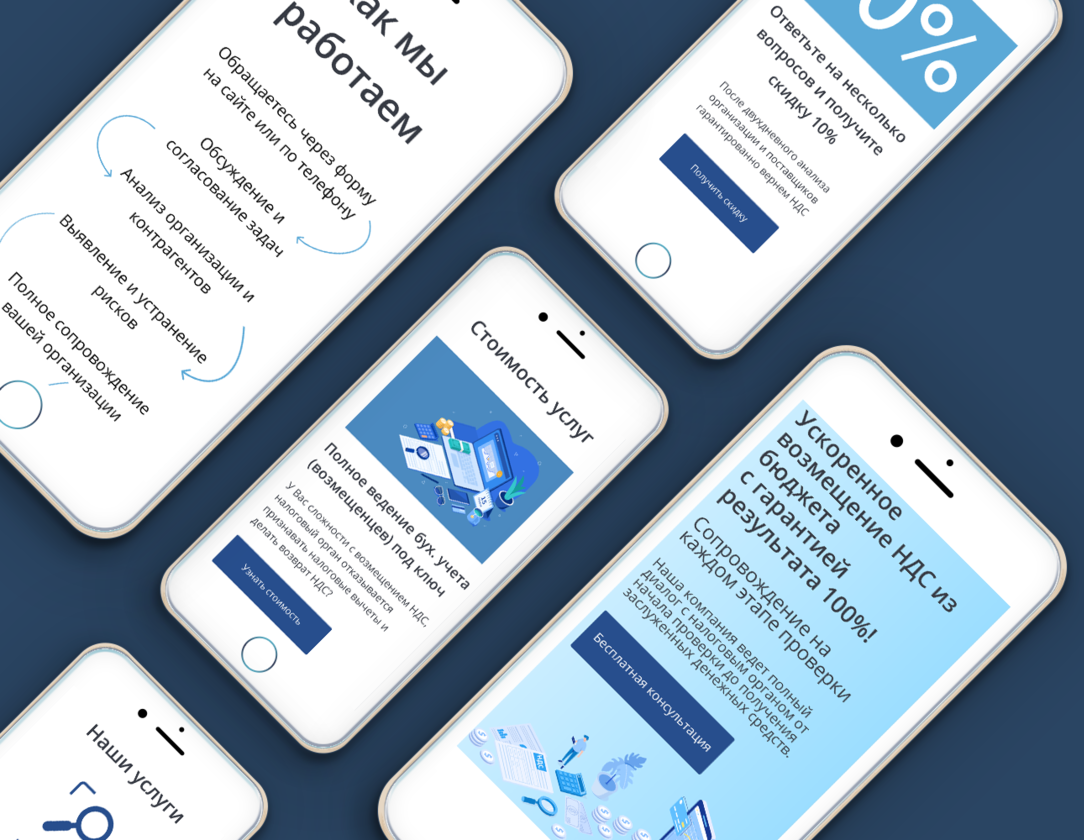 Большие векторные иллюстрации в цвет сайта, краткое описание услуг и кнопки. Т.к. предоставляемые услуги организацией требуют точного изучения для формирования стоимости, кнопки ведут на формы обратной связи.